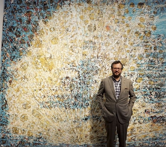 畫廊創辦人Iwan Wirth,於藝術家Mark Bradford 今年的新作《Water in the Ears Puts Guards at the Gates》前合影。(攝影/林亞偉)