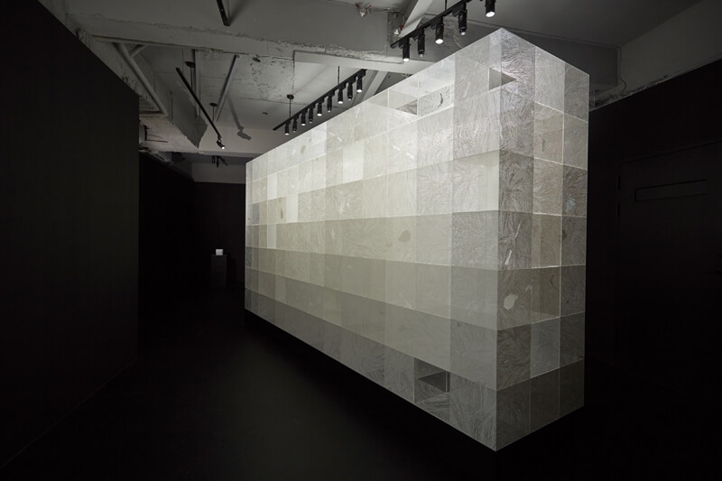 例如今年甫於日本森美術館(Mori Art Museum)「簡單形式」(Simple Forms)主題展中的《Liminal Air Space – Time》一作,在得以眺望東京城市美景的展室裡,一塊薄如蟬翼的透明絲布,隨著空間中流動之風動空氣,幽微柔美地上下緩動著,藝術家所欲呈現的動態,不是所見實體存有的物品,而是環繞著這個物質的周邊之物,例如空氣、重力、流動等種種隱形的力量,透過有形之物而感受到的無形之氣,雖不可見但卻能感性體驗。一如「構築之詩」的透明方形體一般,引領我們遭遇實際上不可見,隨著時間而浮動、又再度被建構的,關於人與事物的內在記憶旅程。