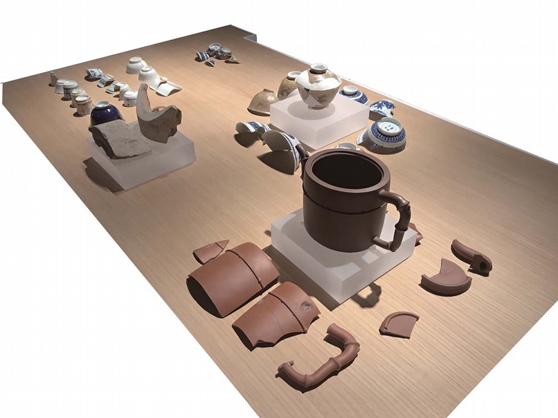出土〈朱泥竹節壺殘片〉在中國宜興窯的內、外銷市場,均有見到相似款式,此外共伴出土大量的青花小杯,來自江西景德鎮、福建德化窯等地製品,當中有一青花小杯殘片杯底印有「若深珍藏」款識。