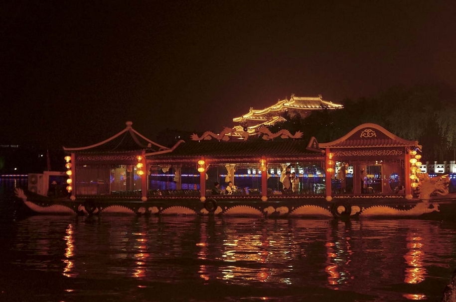 京杭大運河促使揚州成為明清兩代重要的商品集散地。圖為揚州運河夜間遊船。(胡懿勳提供)