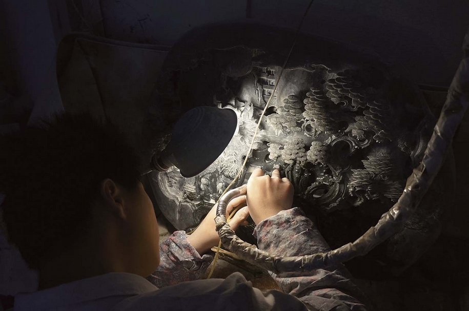 灣頭古鎮的製玉匠師正在雕刻一座玉山子。(胡懿勳提供)