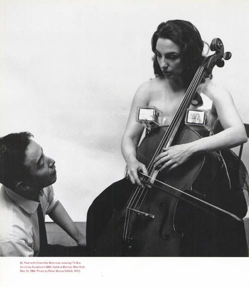 1965年,白南準在凱吉(John Cage)於林肯中心(Lincoln Center)發表的《第五號變奏曲》(Variation No. 5)上,將扭曲的電視影像錄像作品投射在康寧漢(Merce Cunningham)的舞群背後(註4)。如此,甚至早在錄像機權充記錄行為表演藝術之前,白南準已開創性地將錄像視為單獨成立的藝術形式。不久之後,白南準轉向關注必須用來展呈錄像作品的硬體設備——電視螢幕——將之作為創作裝置藝術的雕塑材料。後來, 他又與音樂家慕爾曼 (Charlotte Moorman)合作,將音樂帶入由多媒體呈現的現場行為裡。《生活雕塑電視胸罩》(TV Bra for Living Sculpture, 1969),一件激流派(Fluxus)的著名行為藝術作品,就是這個脈絡裡深具創造力,且令人愉悅的例子。