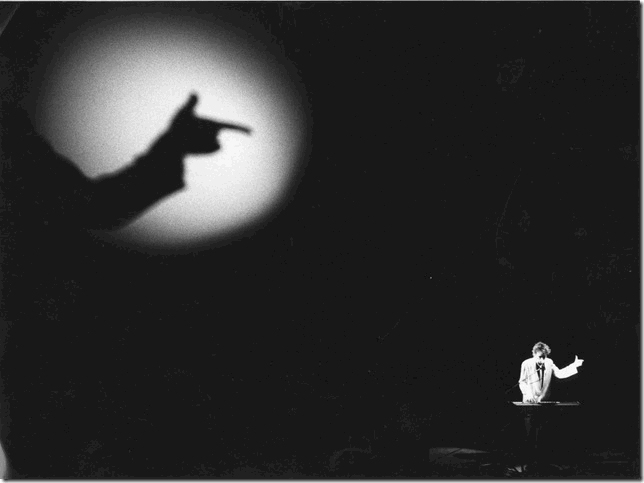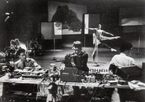 1965年,白南準 (Nam June Paik)在凱吉(John Cage)於林肯中心(Lincoln Center)發表的《第五號變奏曲》(Variation No. 5)上,將扭曲的電視影像錄像作品投射在舞群身後。(鄭美玲提供)