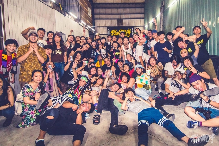 2017年7月,「愁城」在新莊泰山交界處的倉庫內,舉辦免費跨國音樂派對「2017 愁城鬧事:生產線上的噪音.王八蛋的流水席」,圖為活動後的大合影。(立方計劃空間提供)