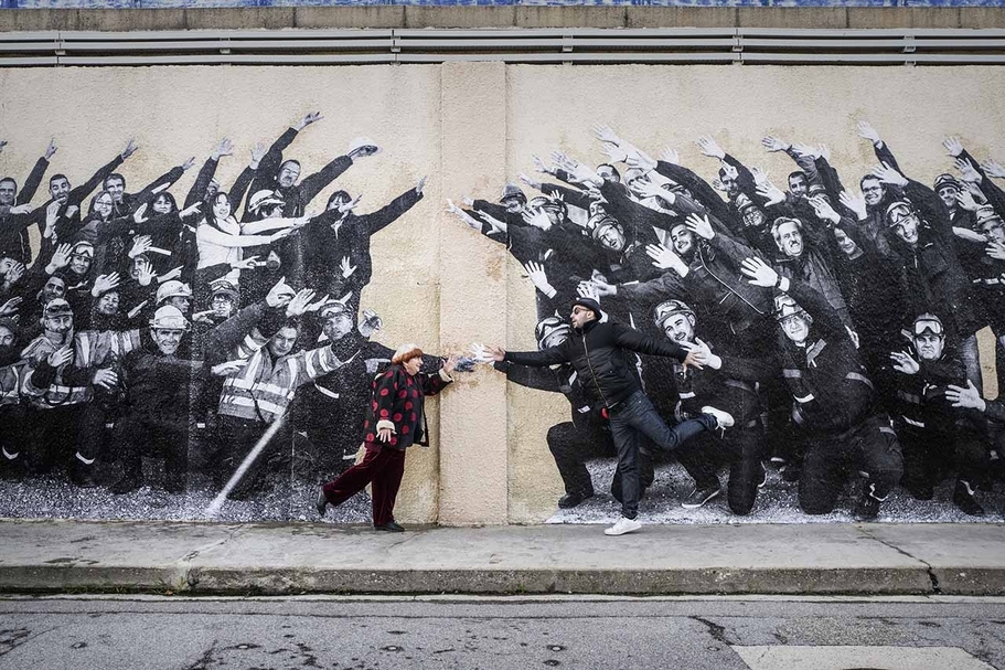 影片內部的多重裝置性,也多次體現為用鏡頭記錄下的事件調度。在凋敝的棄村皮魯沙灘(Pirou-Plage),在普羅旺斯(Provence)的化工廠,在勒阿弗爾(Le Havre)的碼頭……他們邀請拍攝對象聚在一起,不同形式的聚集誕生了種種事件場域,個體記憶融合為某種集體式提喻。更不用說他們幾乎都會再邀請拍攝對象、包括華達與JR自己與張貼後的巨幅肖像合影,再以電影鏡頭完成留念式的凝滯影像。