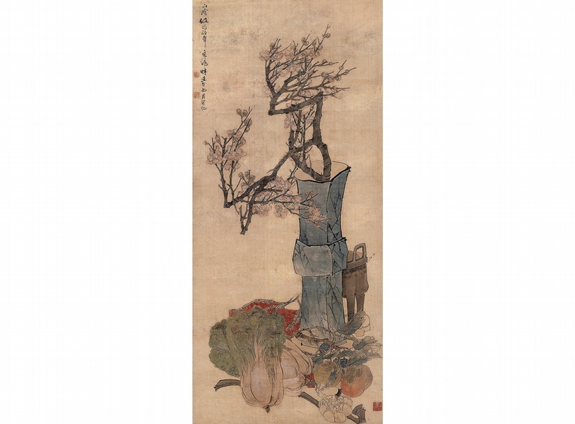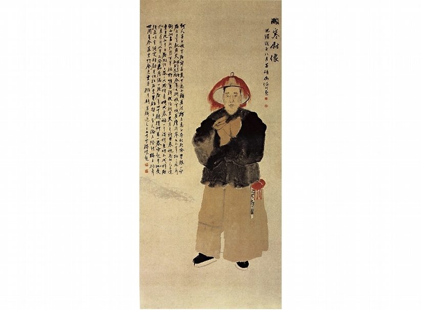 與吳昌碩同為海派四傑之一的任伯年為其好友,任伯年為著名的肖像畫家,其所畫之吳昌碩像〈酸寒尉像〉亦在本次展出之列。此像畫出好友眼中的吳昌碩,身著一襲與之不襯的官服,表情彆扭難耐,為五斗米而屈任小官,然心不在此,生動刻畫出人物情思,堪稱經典。吳昌碩以深厚的金石學養,貫通篆刻、書法、繪畫三藝,以書寫畫,墨氣酣暢,蒼勁粗獷中得見文人率真、樸拙古意。本次展出其書畫八條屏、〈鼎盛圖〉、〈牡丹圖〉、〈歲朝清供〉等精彩作品,齊白石所作〈老少年圖〉更是首次展出,可謂名品齊聚。