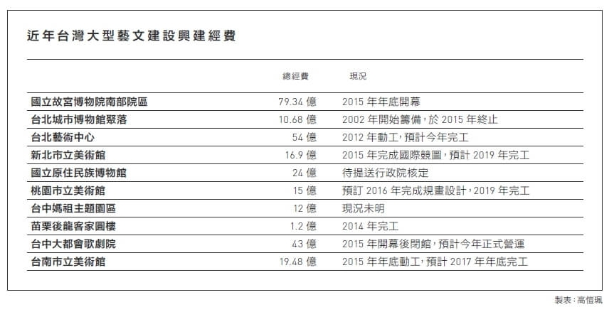 文化預算極低是各縣市普遍狀態,以2013年為例,新竹縣的2.2億、南投縣的1.8億、嘉義縣的1.4億、嘉義市的2億、基隆市的1.6億、台東縣的1.6億和連江縣的9千萬等八個縣市的一年的文化預算,甚至不夠一齣「夢想家」(2011)的演出耗費。然而儘管資源短絀,各縣市還是盡量在從事巨型開發案,例如2016年新北市文化局本身的預算也不過17.58億,但即將要開工的新北市美術館總體工程預算就高達16.9億;台中市的媽祖主題園區在2015年光是媽祖像的基座工程就花掉了6億預算;財政崩盤的苗栗縣在2014年落成的客家圓樓則耗資1.2億。