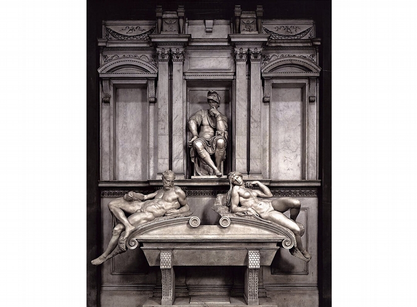 羅連佐公爵的臉部則籠覆在頭盔的陰影之中,以手支腮,兩腳交叉,沉思的姿態象徵內斂型的個性。在思想型的羅連佐公爵之下的石棺上斜臥著一男一女,男子象徵即將入睡的《黃昏》,女人則是象徵正要甦醒的《黎明》,《黃昏》和《黎明》烘托了沉思的氛圍。就整體形象而言,這四尊雕像,除了《白天》以壯闊的肩背以及回轉過來的頭傳達了懾人的力量,仍然帶有米開蘭基羅之壯年雕刻的震撼力道外,其他三尊雖然仍不失雄偉,但似乎缺少了之前的強烈力道;或許米開蘭基羅已經五十多歲,體力與精神不如從前,或是另有其他美感和情感的考量。