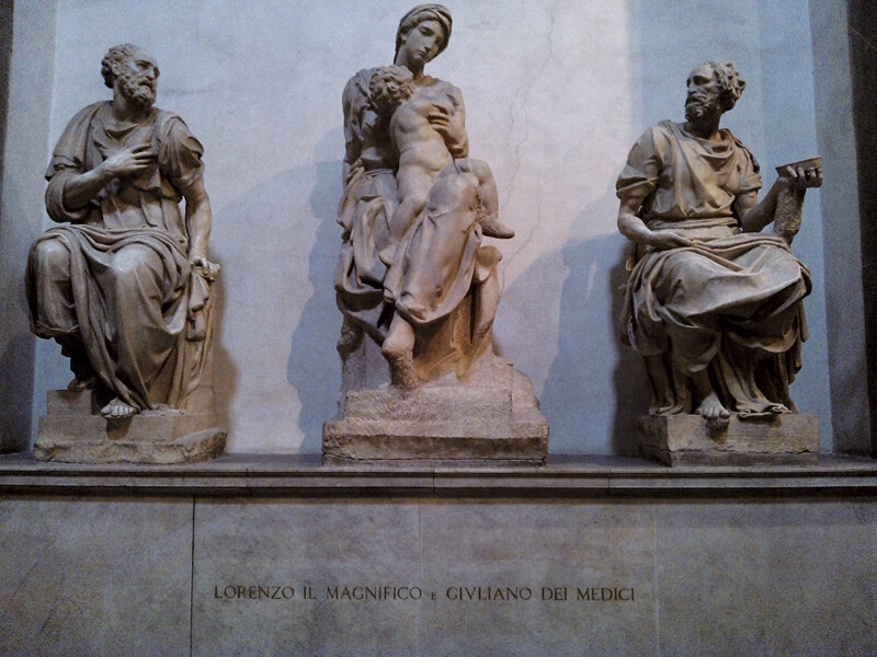 米開蘭基羅的原始規畫是在禮拜堂的四面牆壁安置四座梅迪奇成員的墓室,然而,在1534年離開佛羅倫斯之前,米開蘭基羅卻一直沒有製作最重要的「偉大的羅連佐」(Lorenzo the Magnificent)羅連佐.碟.梅迪奇(Lorenzo de' Medici, 1449-1492)和他弟弟朱里亞諾.碟.梅迪奇(Giuliano de' Medici, 1453-1478)(教宗克里門七世的生父)的陵墓,因此這兩個人的遺體就安置在入口處的石棺,在簡單的石棺上面擺置了一組大理石群像,中間擺置米開蘭基羅製作的《聖母和聖嬰》(Madonna and Child),兩旁則是擺置梅迪奇家族的庇護聖人寇斯瑪斯(Cosmas)與達米安(Damian),這兩尊聖像是根據米開蘭基羅的模型,由他的學生咎瓦尼.安傑羅.蒙托索里(Giovanni Angelo Montorsoli)和拉斐爾.達.盟帖路坡(Raffaello da Montelupo)雕刻而成。
