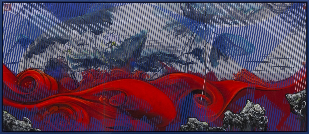 那危《燃荷紅流圖1516》,畫布、油彩、絹、水墨,116×273cm,2015-2016。(新時代畫廊提供)