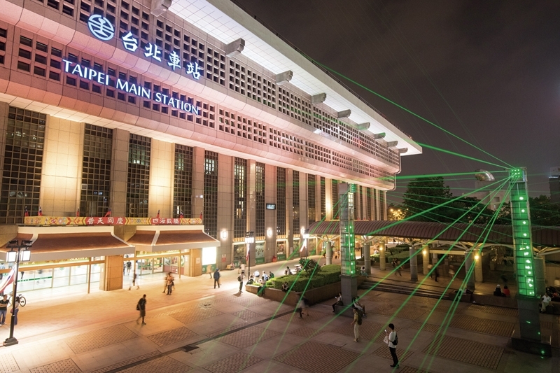 中山南路與中山北路交界處的台北車站座落,是城市迎向外界的實體大門,也成為許多無論旅行與工作者造訪台北時,對於城市最初的共同印象。然夜間的戶外廣場也在時間的累積中成為遊民的棲居所,與移工、民的交誼客廳。面對車站一條隱形階級與國籍的界線,藝術家莊志維則透過雷射裝置作品《裝置微光計畫:車站》,以雷射光束讓這些分割著城市裡人與人之間的關係的界線得以顯見,更希望以光束照亮被社會刻意忽視的社會底層,藉由微光點亮可以被企盼的希望。