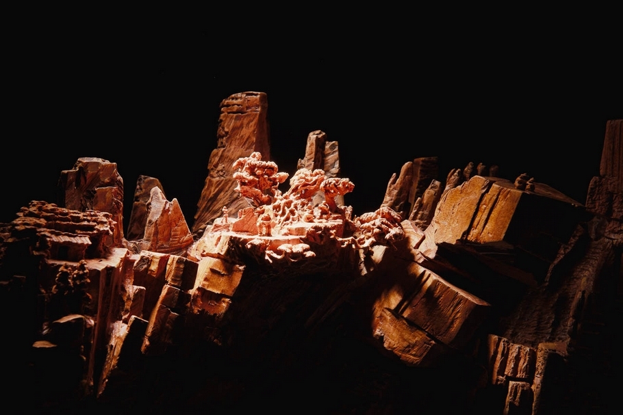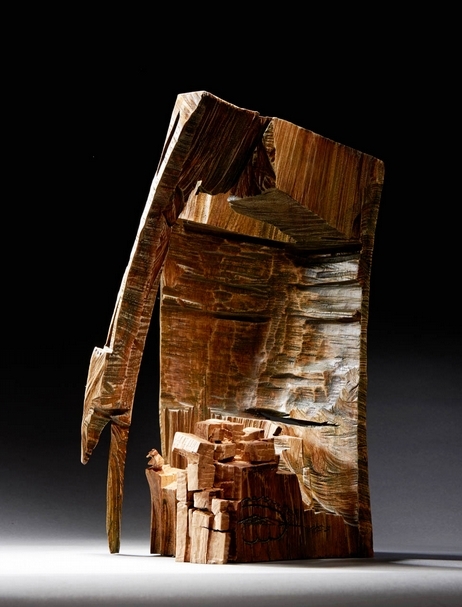 說到張敬,不得不提到其創作的特殊媒材,具有千年歷史的國寶級「古木倒格柴」。「倒格」為閩南語直譯,是指樹木死亡後經過風化、腐殖、蟲蛀等自然作用後所剩下帶有豐富油質的心材,這樣的木材比起一般木材要來得穩定、不易腐裂,且經過長時間的醇化,多半帶有濃厚香氣,外表則是佈滿深刻的風化紋理,是一種可遇不可求的創作質材。