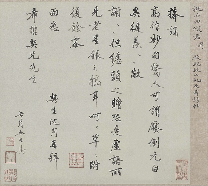 「捧誦高作,妙句驚人,可謂壓倒元白矣。徤羨徤羨。敬謝敬謝。但纏頭之贈恐是虛語,所見者星銀之犒耳。呵呵。草草附復,餘容面悉。契生沈周再拜。希哲契兄先生。七月五日具。」