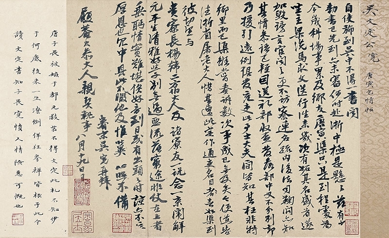 吳寬(1436~1504)這通書劄曾經吳湖帆收藏,他將其定名為〈唐寅乞情帖〉。書劄的內容涉及了明代著名的弘治科場弊案。弘治十二年,唐寅挾解元之名參加會試,在考試前與主考官之一程敏政有所往來。試後程敏政被人彈劾收受唐寅及其同伴徐經的賄賂,案件牽連廣大,滿城風雨,最後查無實據,不了了之。唐寅被拘問後發落到浙江充當吏役。吳寬是唐寅的同鄉,其時在京為官,得知後寫信給浙江的同僚,請求他照顧即將到來的唐寅。信中吳寬寫到:「切望與貴寮長楊、韓二方伯大人及諸寮友一說,念一京闈解元,平生清雅好學,別無過惡,流落窮途,非仗在上者垂眄,情實難堪。」其言辭懇切,一再為唐寅申辯冤屈,流露出對其無限的同情與惋惜。