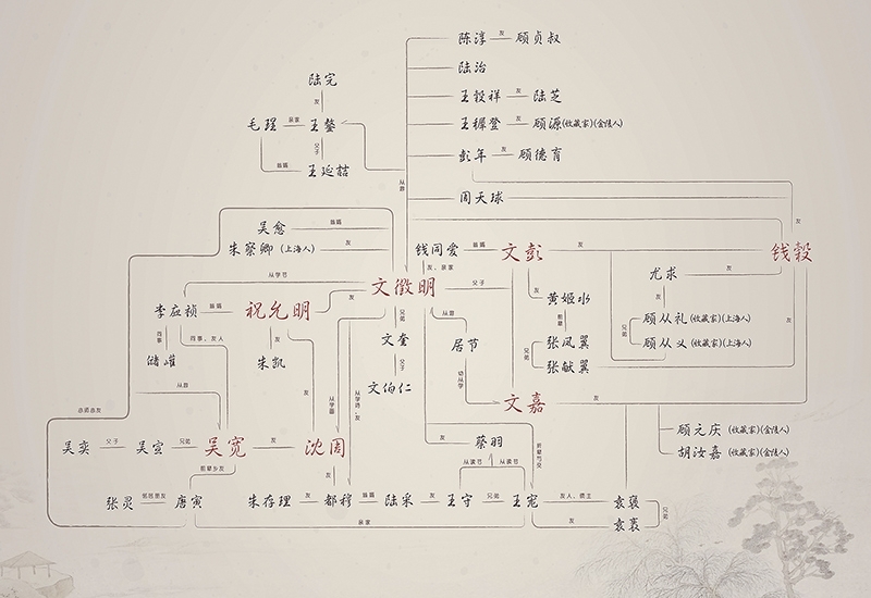 孫丹妍為觀眾精心製作了吳門藝術家的關係圖。關係圖中所提及的文人,展品幾乎都有涉及,其中,紅色字體標出的吳寬、沈周、祝允明、文徵明、文彭、文嘉是較為重要的文人書畫家。孫丹妍講解道:「從關係圖中可以瞭解,明代吳門的文人風格是怎樣逐漸成為主流。明代政治經濟文化中心的轉移,是必然存在的客觀原因,但更重要的因素是蘇州文人這種提攜後輩、抱團共同發展的形態。特別是王鏊與吳寬二人皆在京城為官,他們在推廣吳風的影響力上有著非常大的作用。例如〈吳寬致歐信劄〉這通書劄,既能看出吳寬對後輩的關懷與愛護,也反映出了蘇州文人愛才惜才的風氣,印證了吳門得以聚集人才,形成一個影響廣大的藝術流派的原因之一。可以說,這張關係圖是文人們仕途的保障,同時也是他們擁有共同愛好的圈子。」