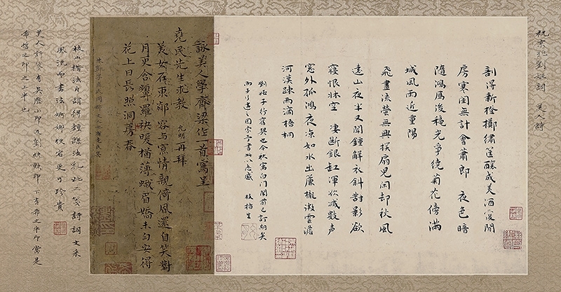 祝允明(1460~1527)才情風流,性格倜儻不羈,書法上諸體皆善,面貌多樣。詩作中時有宮體豔詞,歌女美人。這件展品其實是兩件作品裝裱在一起。其一是祝允明代一位劉姓女子寫懷失約情郎的小詞。另一件是仿照齊梁時期的宮體詩而寫的詩歌,向友人朱凱求教。難得的是,兩者都是小楷,並且是兩種不同的體貌,〈劉姬詞〉學鍾繇,宮體詩學王獻之的〈玉版十三行〉,皆為祝允明小楷書的精心之作。