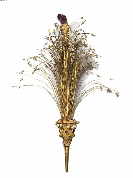 「超越國界的珍寶」說的正是位於陸上絲綢之路中繼站回部,地處歐亞交接帶,多元民族並存,東西文化交融,在藝術品上產生文化並存的現象。清〈包金嵌珠石帽花〉(圖10),造形特殊,中間有一中心支柱,以紅寶石為帽花,器身並嵌紅綠寶石、珍珠外,各式金線從中心柱底部交雜延伸,見中心柱下端為一細長插榫,應是伊斯蘭文化中插於頭巾上的裝飾配件。