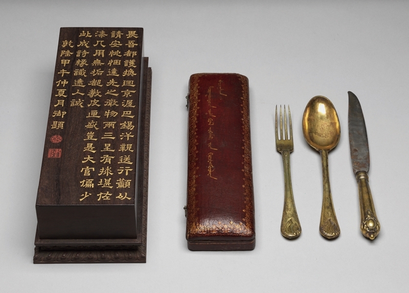 「尊貴的飲食器用」單元中,呈現出反映四季遷徙的游牧民族所代表的生活用器,包括木碗、刀叉等。清〈土爾扈特部鍍金叉匙匕首組〉(圖5),為一套包含刀、叉、湯匙的實用組合,銅鎏金製成,置於皮盒內,皮盒上寫有滿文並裝飾豐富邊花,整套又置於長形木匣內,並刻有乾隆御製詩,可推測此件刀叉組為乾隆三十九年(1774)進貢入宮。但在當時不使用刀叉的清宮中,這組文物更顯突兀,原來這件刀叉組的背後有一段土爾扈特部的遷移故事:「土爾扈特部原是蒙古四部之一,因準噶爾部勢力日漸龐大,失去放牧場地的土爾扈特部於1628年開始西遷至裏海北側伏爾加河一帶。後在沙皇施壓之下,土爾扈特部又再次搬遷,正值準噶爾部被滅,因此他們又回到回部一帶。渥巴錫為當時土爾扈特部的首領,為示效忠,他曾在熱河覲見乾隆皇帝,也先後呈進了自己的寶刀及這套刀叉組。」陳慧霞說明,清宮真正使用刀叉是在19世紀由傳教士帶入宮中,而〈土爾扈特部鍍金叉匙匕首組〉反而是受到俄羅斯生活影響所製。