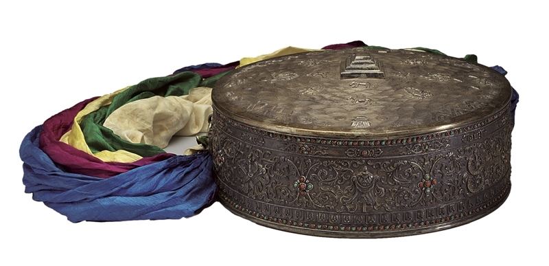 「藏傳佛教的浸潤」講述由印度教與西藏「苯教」融會而成的藏傳佛教縮影,藏傳佛教除對蒙、藏地區影響甚大,清帝國多位皇帝也虔誠地信奉藏傳佛教。藏傳佛教一大特點就在於其法器、供具,如念珠即為一例。展場除展出多件各式材質的念珠,尚有一件清〈嘎布拉念珠〉(圖6),為乾隆皇帝七十大壽時班禪喇嘛進贈之物。此外還有一件據傳是送與慈禧太后的〈銀壇城附五色哈達〉(圖7),銀製盒,盒蓋中央為須彌山、旁邊為鐵圍山,壇城的四個方向代表東西南北四方。而此件作品附有五色哈達,哈達為藏傳佛教中的長方形絹布禮敬法器,通常為單一、複數顏色,又以五色最為尊貴。