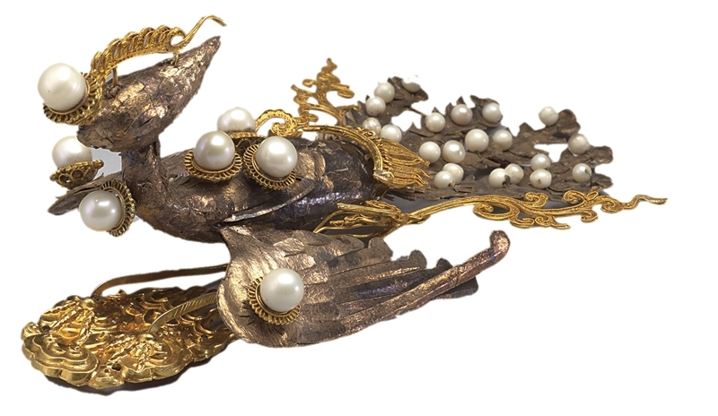 清18~19世紀〈金嵌珠樺皮鳳冠飾件〉(圖1),骨架為木製鳳凰,鳳凰呈展翅貌,除部分構件以金箔貼之,底座為金製外,羽毛部分皆以樺樹皮裝飾,並飾以金箔,同時嵌有珍珠,相對輕巧好佩戴。樺樹普遍生長於北亞一帶,北亞游牧民族經常使用樺樹皮打造簡單的盒子等生活用品,早在元代皇后佩戴的姑姑冠即使用有樺皮。〈金嵌珠樺皮鳳冠飾件〉外形學習自明代以來的纍絲金鳳冠,但在材料的使用上則汲取了游牧民族的傳統。