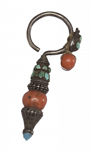 說到西藏,人們自然而然就會想到藏傳佛教,但在第三單元「珊瑚與松石的對話」中,陳慧霞就是要提醒大家,除了藏傳佛教,草原游牧民族中不可忽略的還有當地貴族的生活。蒙藏地區的貴族喜於使用各式寶石、珊瑚,以及綠松石等,身上配件甚為繁複,從耳墜、嘎烏(即佛鍋,藏族貴族胸前佩戴的小佛龕),到手上佩戴的臂釧、戒指等,都鑲嵌有各色天然寶石,且造型都比一般常見者略大,顯示游牧民族豪邁不拘的性格。〈銀嵌珊瑚松石耳墜〉一件(圖9),耳鈎的部分碩大,以珊瑚為主外,尚鑲嵌有綠松石。陳慧霞推測這件作品應是男性使用,藏族男性多只佩戴一側的耳墜。