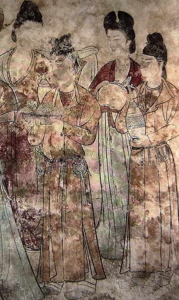 究竟楊貴妃所佩戴之香囊為何?竟可經久而不腐爛!雖說在唐墓壁畫中不難見到許多侍女腰際佩戴有織繡香囊(圖2),但唐代香囊其實並非只有織繡香囊,尚有另一種以金屬製成、過去被稱為「薰球」或「香球」的圓形器。1987年,陝西扶風法門寺地宮中出土了大量的金銀製香具,據一同出的《衣物帳碑》所示,在唐僖宗所奉納的金銀器中有「香囊二枚」,此正好能對應到出土的一大一小兩件香球,由此才揭開了香囊與香球實乃「共名」,以及楊貴妃佩戴的香囊可能為金銀製品的歷史謎團。
