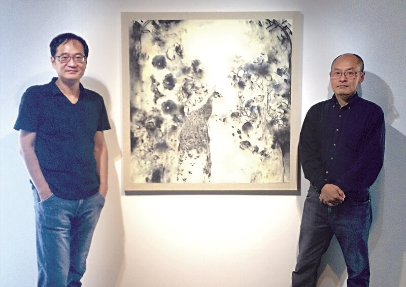 策展人王嘉驥(左)與藝術家梁兆熙合影於《花鳥A03》前。(攝影/陳芳玲)
