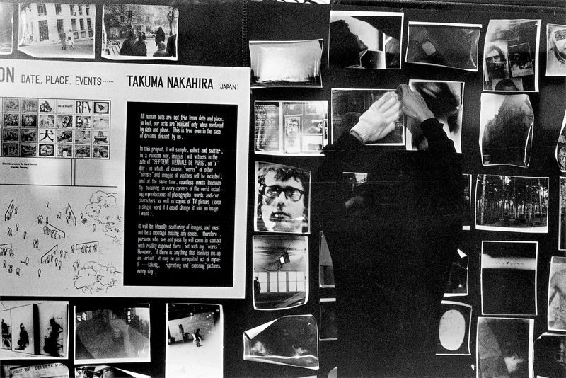1971年,中平卓馬參加第7屆巴黎青年雙年展,現地進行攝影計畫「循環:日期、場所、行為」,在展會期間的特定日子,他每天揹著相機從旅館出發,遊走在巴黎的大街小巷與雙年展會場,將接觸到的人事物捕捉至底片中,並且在黃昏入夜時進入暗房沖洗、顯影、放大,將還溼潤著的照片張貼展示於會場牆上,呈現「一日限定的現實」。展出的照片除了中平卓馬拍攝的一切,也包括別人拍攝他的影像,呼應他所提出的攝影主張:反對從個人立場出發來描繪世界、拒絕以單點透視統御世界的企圖,而是建構變動不居的無數視點。此外,他認為自身所呈現的,除了最終展示的大量照片,還包括攝影、沖洗以及前往各個地點等行為的總和。雖然在這項計畫的執行過程,他與主辦方起了嚴重衝突,使他憤而撤掉全部作品,退出巴黎青年雙年展,但「循環:日期、場所、行為」無疑預示了他未來攝影實踐的方向,如今也被視為日本當代藝術與攝影連結的契機之一。
