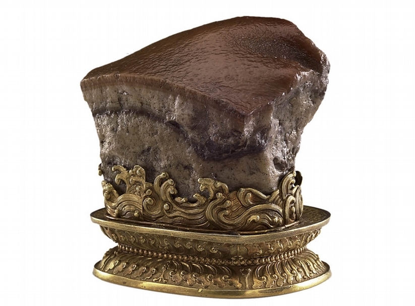 清朝〈肉形石與海濤、蓮花紋金座〉,故雜 000178。台北國立故宮博物院版權所有。