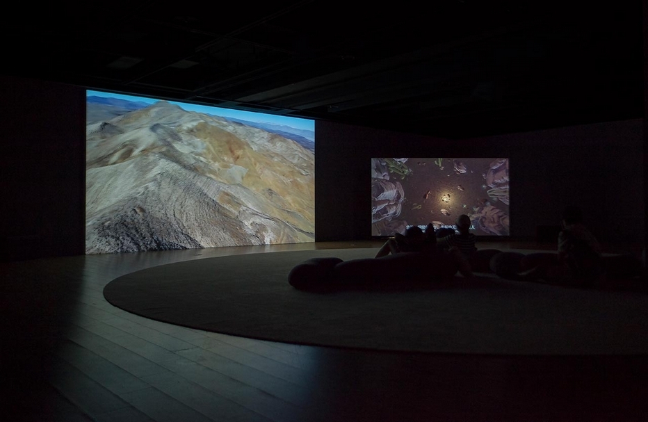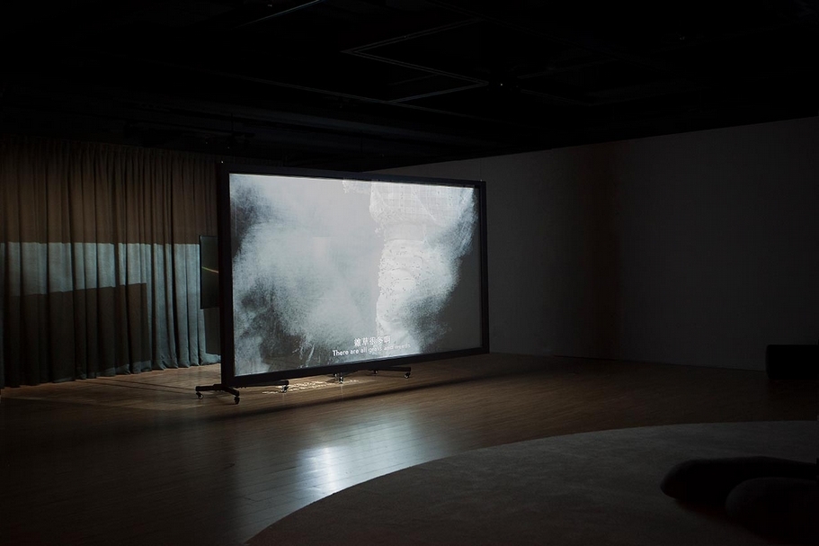 在展場的影像配置上,作品與作品間不以物理隔間產生實體阻隔,而是以半透明的布簾讓影像穿透、並有孔隙的呼吸感,也讓作品與作品間的細微線索相互攀登、越域。進入「凹凸史」展間即有種試圖鬆弛身心的狀態,或一種進入他人起居、親密的包覆感,從《石頭幾則》如玄關般的長廊擺放著礦物台座、各種廢棄物材質再製、不明所以的怪奇作品,到牆角如壁爐位置、或經典童話中穿梭時空的矮門影像裝置,垂下的簾幕襯托出《玩石頭的人》錄像作品,敘事在石陣的把玩、排列間展開。而《Salvation Mountain》、《名字不為人所知的》間,擺置了大尺幅的圓狀暗色系的地毯,上頭安放了如石堆般的懶骨頭,觀者似乎能連結《Salvation Mountain》三位跨時空角色在營火旁閒聊的親密感,也如同走入一種藝術家創造的內在心理的實體空間。「對這個展覽最一開始想像,會想像這裡是我自己的空間,這些靠枕、窗簾和簾幕,並不是一種裝飾,或者它們其實呈現一個我在思考這些線索關聯性時視野的真實性。」