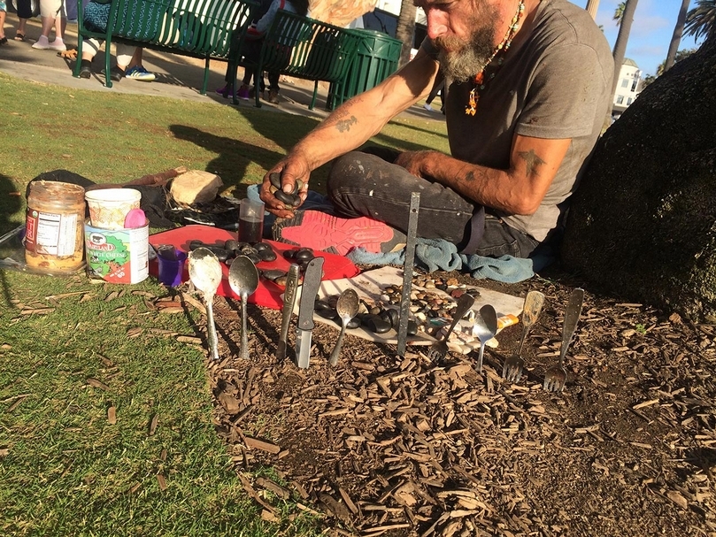 《玩石頭的人》中把玩石頭的流浪者。(鳳甲美術館提供)