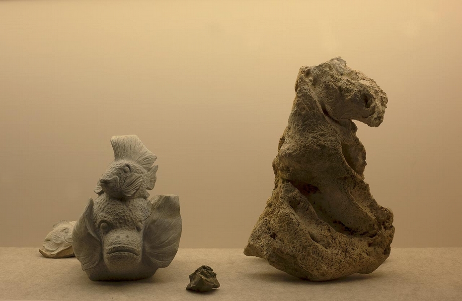 安置在《名字不為人所知的》的背後是《石頭幾則》,劉玗藉由紀實的訪談影像,揭露了淘金聚落居民創造生活的另一面向,他們撿拾廢棄物、漂流木等來重新加工創造,是為人們口中所謂的「素人藝術家」。劉玗在多年的造訪記錄當中,看到歷史層疊的復返與堆疊,人們在勞動、信仰等活動間奔波,而這些生活周遭又成為居民咀嚼再創造的養分。這些歷史與地域、風俗的連結與共存穿透,也使得她統整出關於此次展覽的命名——「凹凸史」,在各種聚落、遺跡、地理之中的人類行為,人們鑿深、挖掘、掏空;人們也堆砌、創造,在一條無論是地表、歷史的軸線上正反的來回,而這些正與負、虛與實的事件,也構成其個人世界歷史觀所描繪的座標。
