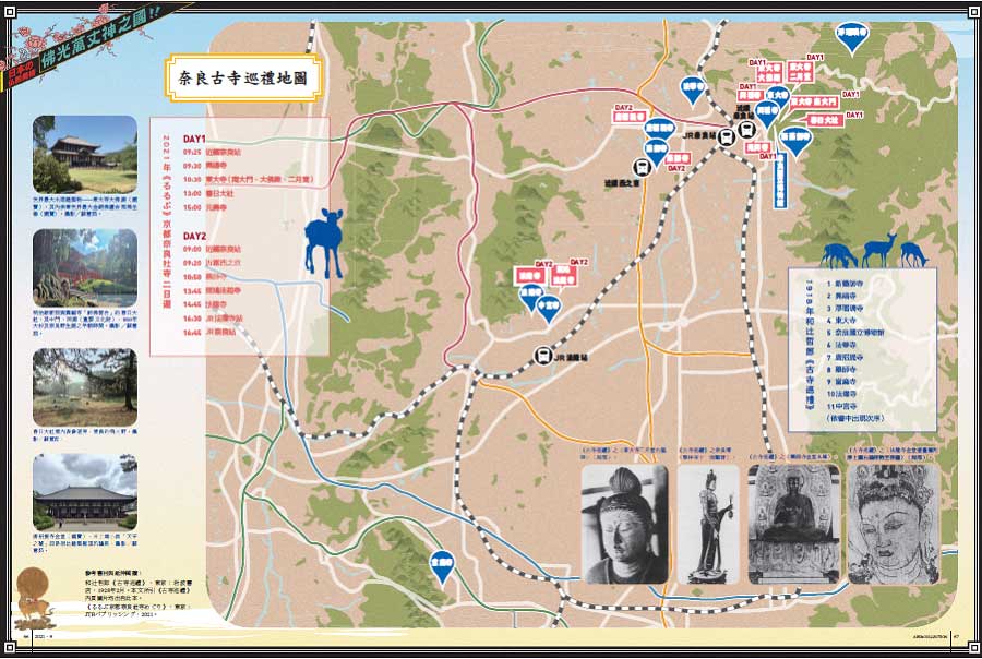 追佛怎麼追?時下旅遊雜誌《るるぶ》推出「奈良古社寺巡禮最強二日路線」行程,引導佛女們運用近鐵電車、公車及JR,週末暢遊奈良7寺1社,包括興福寺、東大寺、春日大社、元興寺、唐招提寺、藥師寺、斑鳩法起寺、法隆寺。其實,在百年之前(1918),早已有人利用電車和人力車,挑戰在五天內走訪奈良10寺1博,包括新藥師寺、興福寺、淨琉璃寺、東大寺、奈良帝室博物館(即今奈良國立博物館)、法華寺、唐招提寺、藥師寺、當麻寺、法隆寺、中宮寺,並且寫成遊記出版,此即和辻哲郎(1889-1960)於大正8年(1919)出版的《古寺巡禮》。