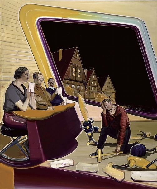 就以勞赫的敘事畫《謎題》(Quiz,2002)為例,在一個工作面試般的場景中,一名男子在三名面無表情的面試官或主考官監視下,試圖將地板上散落的大型幾何益智模型拼組起來。但男子顯然無法完成這項任務,他絕望地用雙手捂著臉,其中一只模型甚至超現實地站立起來,像漫畫人物般嘲笑他的失敗。儘管這幅畫完全可以如持反對意見的藝評家般,視為色彩及人物皆不討喜、充滿負面無助意味的荒謬生活畫面,但從另一種角度來看,這幅畫又可以毫無違和地解讀為東西德統一後的現實寓言:從共產社會來到西方世界求生存的前東德人民,卻發現自己窘迫地陷入一個完全不熟悉遊戲規則的世界。