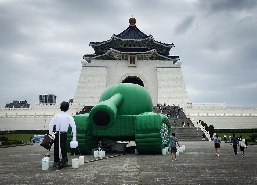 還記得6月的第一天,鬱積在台北景福門周圍此起彼落的叫喊、以及一再被空洞的政治口號所熬煮的躁動情緒,讓夏日午後厚重濕熱的空氣,顯得更為黏膩、且窒息難耐。當日,套著紅杉、披著國旗衣的群眾,為響應政治人物的呼聲,試圖再製13年前竭力推翻執政者的紅色氣勢。但這些搬演歷史反動劇碼的激情,在慢慢竄流進自由廣場的同時,卻也跟當下另一幕重現六四歷史悲劇的現場之間,交互碰撞出主流論述和官方歷史所無法化約的社會矛盾。試想,沉浸在庶民幻象和選舉造勢熱情當中的中華民國人,在揮舞和穿戴著黨徽與國徽混淆不分的象徵物之時,要如何擺脫黨國威權幽靈的附體,進而去感受那站在巨型獨裁者銅像和氣球戰車砲口前的坦克人所象徵的抵抗精神?顯然地,如果只憑藉著過時的國共內戰視野、或今日早已模糊不清的反共意識,是遠遠不足以讓我們去梳理「景福門–紅衫軍」和「自由廣場–坦克人」,此兩場歷史劇碼的並置與交會所可能產生的交集或衝突,也更無法理解後者在中國遊客的內心中所蔓生出來的創傷記憶與各種政治問題的複雜性。但另一方面,這一尊被水箱和繩索固定在民主大道上的坦克人氣球雕塑,對其他國家的觀光客來說,能夠再進一步開展思考的,恐怕也已經不是被各種圍繞著六四事件的論述所綁定的政治意涵,而更多是在各個相機鏡頭前,藝術品作為奇觀文化之消費物件的剩餘意義。