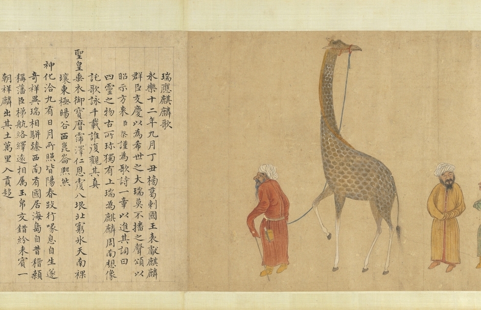 這些神獸的到來,「鄭和下西洋」幫了不少忙。永樂皇帝登基之後,命令鄭和出任外交工作,先是前往日本、暹羅建立邦交朝貢關係,而後他帶領龐大船隊,七次遠航至西太平洋、印度洋一帶,為明朝帶來更多的盟友國家、新知,還有神獸。永樂二年(1404),安南(今越南)送來一頭白象給皇帝朱棣,引來眾人圍觀驚呼。中國傳統認為,若帝王的政教事業能遍布各地(王者政教行於四方),白象便會前來,因此這項外交禮物讓永樂皇帝龍心大悅。不只如此,榜葛剌國也在永樂十二年(1414)進獻身軀龐大的「giri」,永樂皇帝及大臣斷定是中國神獸麒麟。不過今人一看應會啞然失笑,因為這隻「giri」神獸只是動物園常見的長頸鹿。而長頸鹿也在糊裡糊塗之間,成為中國強盛的佐證。