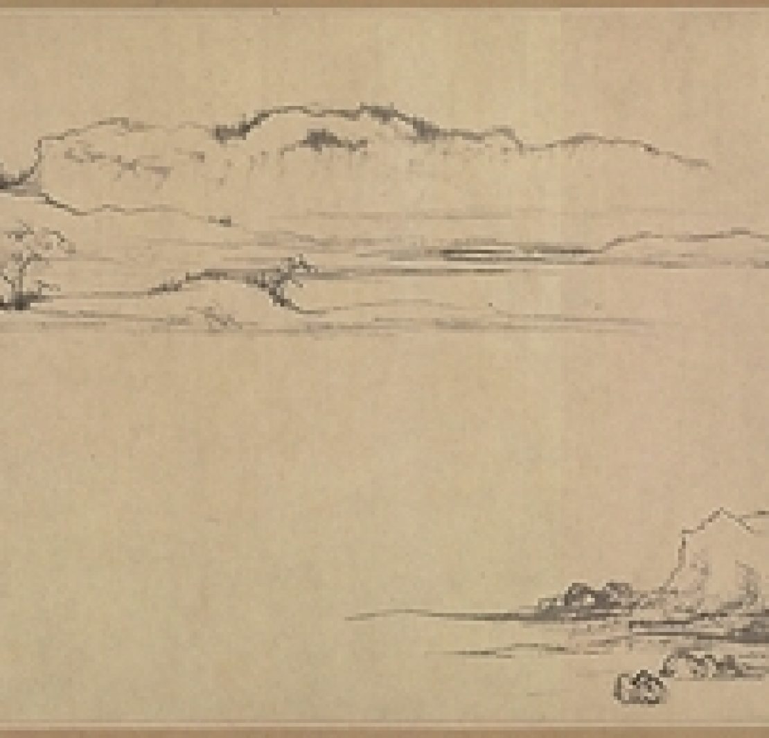 在趙孟頫的繪畫創作中,最具特色、變化明顯而又影響深遠的,非山水畫莫屬。其山水畫主要繼承五代董源和北宋李成(即所謂華北與江南兩大畫派)之傳統:像是藏於美國大都會藝術博物館的〈雙松平遠〉(圖9),構圖採用近大遠小、平遠推移的布局;畫石以淡墨臥筆、層層皴染,畫出「淡墨如雲霧中,石如雲動」的感覺;畫樹則以尖瘦的筆法描寫弧形上仰的「蟹爪枝」,這些畫法很明顯地來自於李成畫派。至於本次展出的〈水村圖〉(圖10),畫面右下為近景坡岸樹石,左方為曲折蜿蜒的河流,切割左右兩邊的矮丘、沙洲或坡陀,一直延伸至畫面上方的遠景,全幅展現江南一帶平遠清曠的景致;畫中使用了「披麻皴」來刻劃南方土石鬆軟的質理,搭配濃淡相宜的點苔法,讓景物和諧地融合在迷濛幽邈的空間之中,這些則是得自「平淡天真」的董源之真傳。