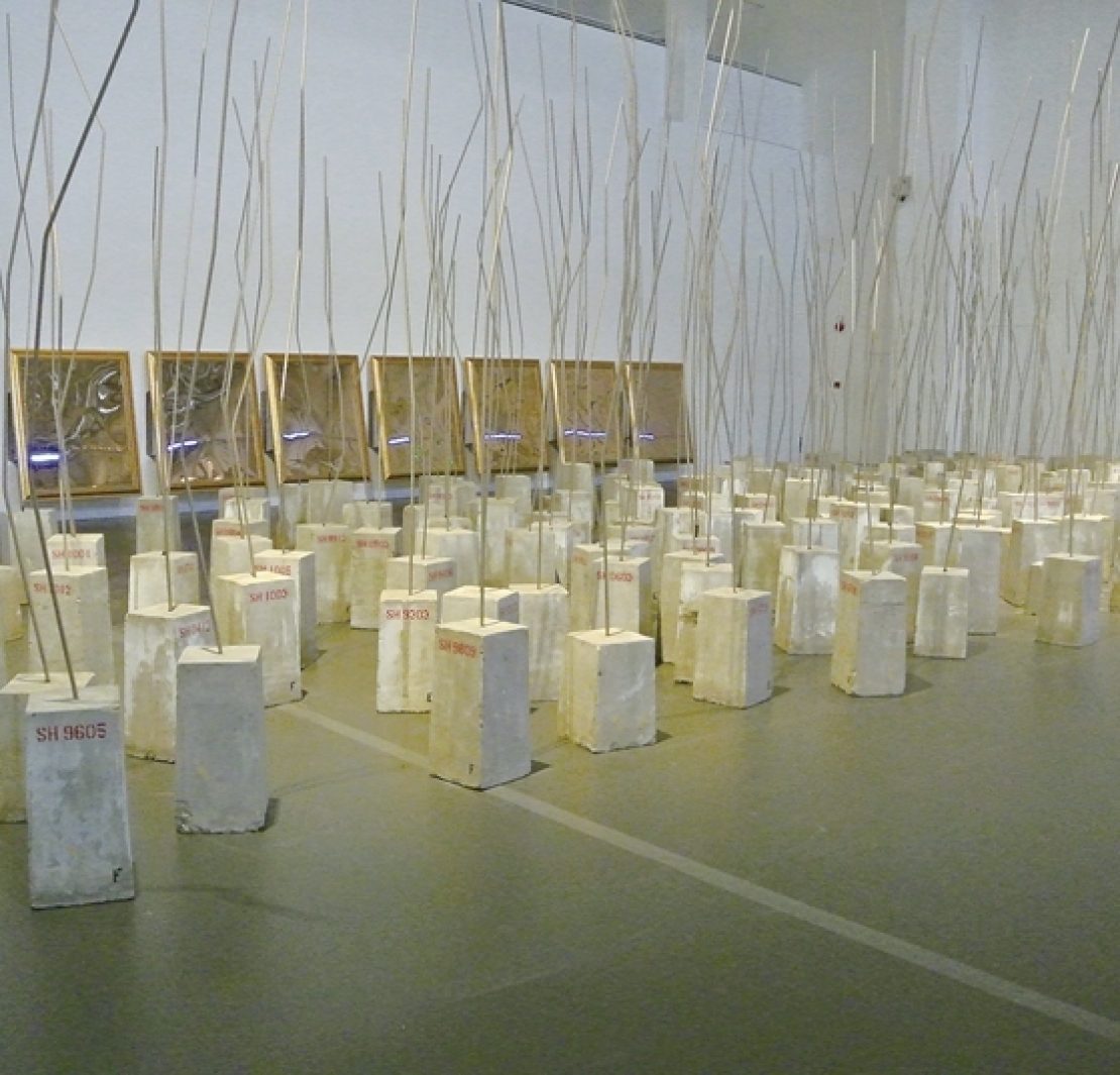 山和水,一直是申凡創作中不斷研究的主題。這件《山水-920》分別從點、線、面著手,他的山水並不關乎自然景象,而是證券交易的指數資料。12件鏡面不鏽鋼作品與現場228個專門澆築的水泥基座放置在一起,金屬與石頭,表面顯得那麼的格格不入,實則共同反映了被物質生活控制、扭曲的精神山水。(文/張亞慶)