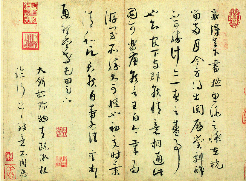 張方平(1007~1091)〈書尺牘(名茶帖)〉(圖11),此札書寫於相當精美的卷草砑花箋上,顯然是因為致謝友人餽贈名茶而特意挑選。收信人打開信的第一印象就是拿在手上的紙,在物質上必然可以透露不少訊息,例如書寫者心態、紙張工藝、紋飾意涵等,可說是這些文人所普遍共享的書寫文化。