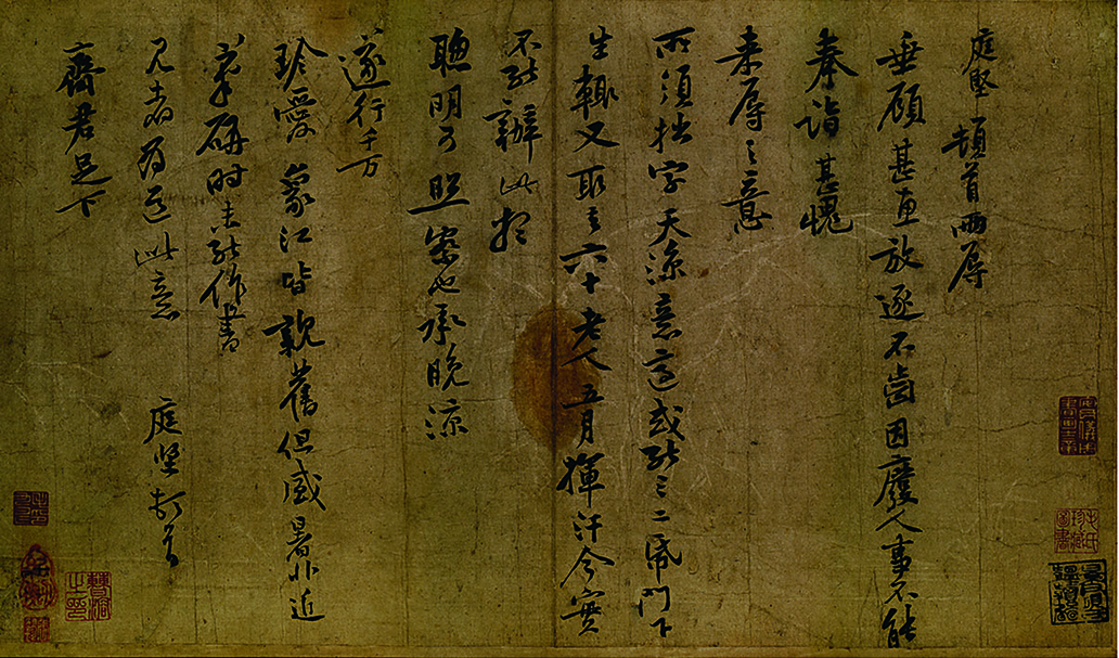 宜州書信中有一封相當珍貴的信札墨蹟仍傳世,內容:「庭堅頓首。兩辱垂顧,甚惠。放逐不齒,因廢人事,不能奉詣,甚愧來辱之意。所需拙字,天涼意適,或能三二紙,門下生輒又取去。六十老人,五月揮汗,今實不能辦此,想聰明可照察也。承晚涼遂行,千萬珍愛。象江皆親舊,但盛暑非近筆硯時,未能作書,見者為道此意。庭堅頓首齊君足下。」(參考圖13)信中提到自己是六十老人,所以時間當為崇寧三、四年中的五月。若當時已有門下生取去所寫書法,應該就不會是剛到宜州的崇寧三年五月,畢竟當時連基本生活都很困難,遑論寫字、教學生。因此,時間應該是指崇寧四年的五月,此時黃庭堅已經安頓下來,而且開始有學生跟隨。