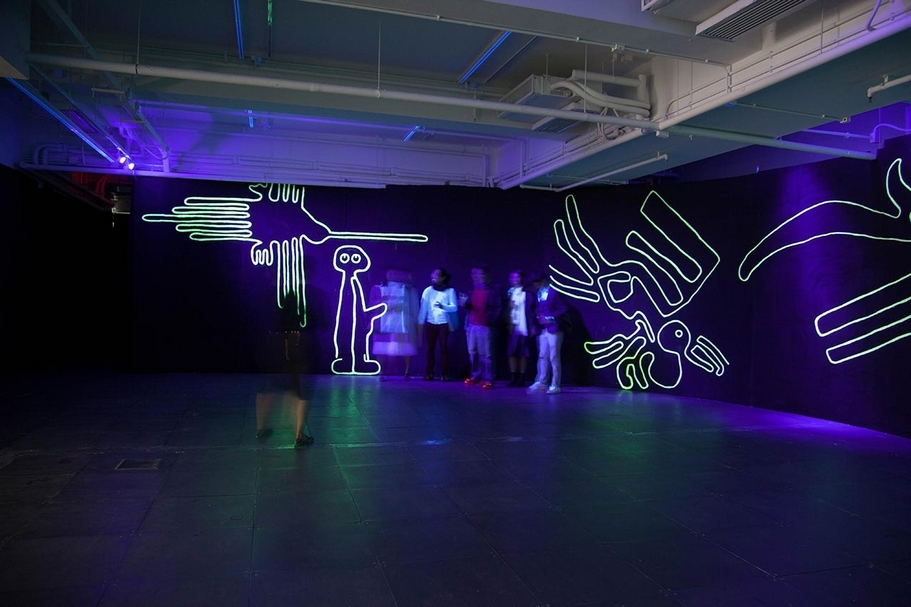 《霓虹荒野:納斯卡線》是展覽中最大的一件作品,轉換了畫廊空間的形狀和本質。這件作品直接引用了秘魯著名的納斯卡線。這一奇觀是由刻於地表的一系列巨型線條組成,創作於1500至2500年前。儘管人類學家相信它們出自古代納斯卡人民之手,但這些圖像符號廣泛地被認為是外星人的傑作。梁半使用特制螢光材料,在一間特別定制的黑色房間的牆面上重現了納斯卡線。這件裝置所強調的謎題,不僅僅是古代人類文明如何和為何創造這些圖像,更重要的是,為何人們更願意相信它們來自於外星生命?《霓虹荒野:納斯卡線》對我們理解自身文明的能力提出了質疑。