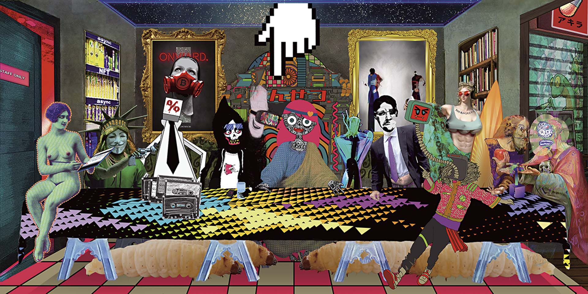 而由Async.Art平台推出的《最初的晚餐》(First Supper),則是結合可編程藝術創作的NFT作品。可編程藝術平台Async.Art於2020年2月推出,其原初便是為了探討「對藝術進行編程會如何?」的一場藝術實驗。所謂可編程藝術為一系列利用電子元素作為繪畫中「顏料」的創作,目標是將傳統繪畫中的顏色、紋理、構圖等元素,與這些電子組件或元素融合在一起,以創造一種以時間為基礎的互動藝術。
