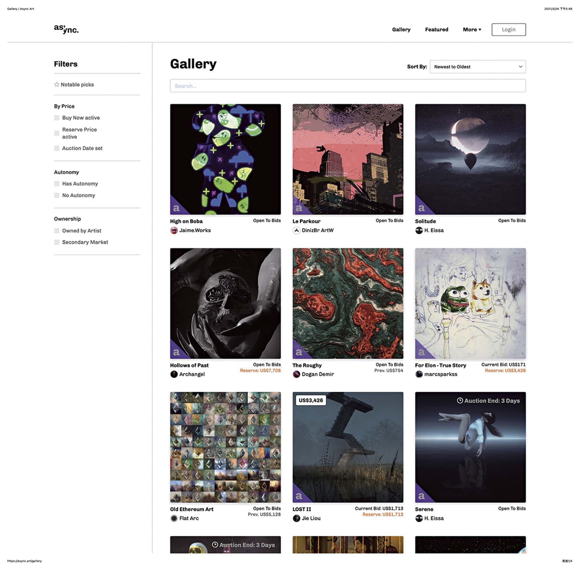 而近來攻佔所有媒體版面,本名溫克曼(Mike Winkelmann)的Beeple,其創作的《每一天,前5000天》(Everydays:The First 5000 Days)結合了5,000幅其過往將近14年每天創作的單幅數位畫作,成為大型傳統藝術拍賣公司首次以NFT形式拍賣的純數位藝術作品。拍賣行佳士得以單一拍品專場的方式拍賣,《前5000天》從100美元起標,最終以相當台幣20億,6,934萬6,250美元的高價成交,不僅刷新任何網上拍賣的出價,也一舉成為在世藝術家成交作品第三高價,超越佛洛伊德(Lucian Freud)、李希特(Gerhard Richter)等人,甚至直逼今年年初剛締造昔日大師第三高價,波提切利(Sandro Botticelli)的《手持圓形聖像的年輕男子》(Portrait of a young man holding a roundel,8千萬美元落槌,9,218萬美元成交)。