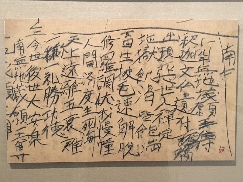 寫作這篇文章、旅次於東京的同時,我去橫濱美術館看了村上隆(Takashi Murakami)的收藏展,裡面似乎理所當然地也收了井上有一用硬筆書寫宮澤賢治(Kenji Miyazawa)童話的作品。在此之前,我到了神戶的橫尾忠則現代美術館,發覺他是那麼大量地使用書法在他的創作與設計之中。最後,我在離開東京前的早晨,拜訪南池袋的法明寺,海上雅臣在井上有一身後幫他立的石碑「幽顯」,亦靜靜地佇立於法明寺無人的庭園。朝陽初至,我望著法明寺前佈告欄的書法字,想起自己在京都、奈良、大阪所遊歷過的法隆寺、東大寺、春日大社、興福寺、三十三間堂、金閣寺、銀閣寺、南禪寺,沒有一間寺院,沒有一天,它們不在繼續著書法寫經的活動。曾經為法隆寺火災咆哮過,說過「書法是萬人的藝術」的井上有一,並沒有僭稱自身書法的至高性,就像陳界仁在東京進行的《殘響世界》演講劇場一開始所講的:「婆羅門不得獨稱:『我種清淨,最為第一。』」井上有一雖然早慧,得到前衛書道與國際的肯定,但他從未宣稱其獨得書道三昧,反而守貧、拒俗,遠離權力與金錢,在日本戰前的兒童自由美術教育中、在戰爭疏散的實踐歷程中,提取出書道的基本精神,透過死亡的洗禮,浸潤於書寫的生命中,日日絕筆,獲取漢字書寫者的清淨靈魂。