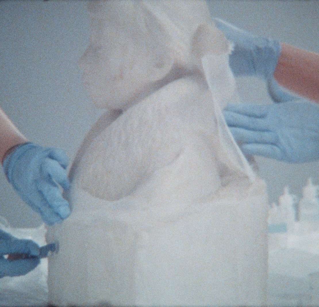 我們這次選擇用8mm底片呈現雕像的修復過程,並使用大量特寫鏡頭,就是希望呈現無法再被放大的粗糙的畫面顆粒組構下,微觀的純粹材質(底片)與物質(大理石/原石)的世界。而在那個使用8mm底片記錄影像的年代,聲音常常是無法被如此細膩的紀錄呈現出來,而是如大家的記憶中,那種錄製在聲音膠卷上的扁平麥克風聲線。所以我們拍攝這部片時,決定反其道而行,呈現出最細微的修復聲音,創造微觀,彷彿正在觀眾耳邊進行修復工作的聲音世界。