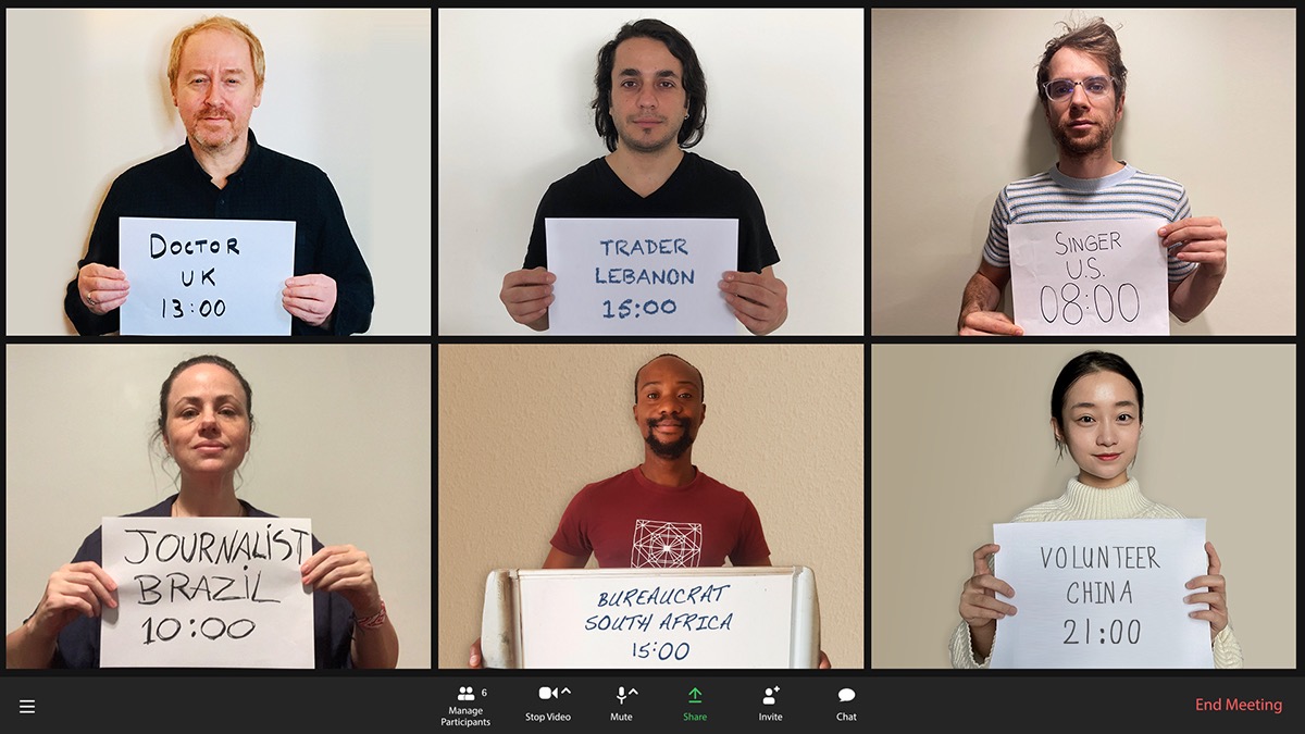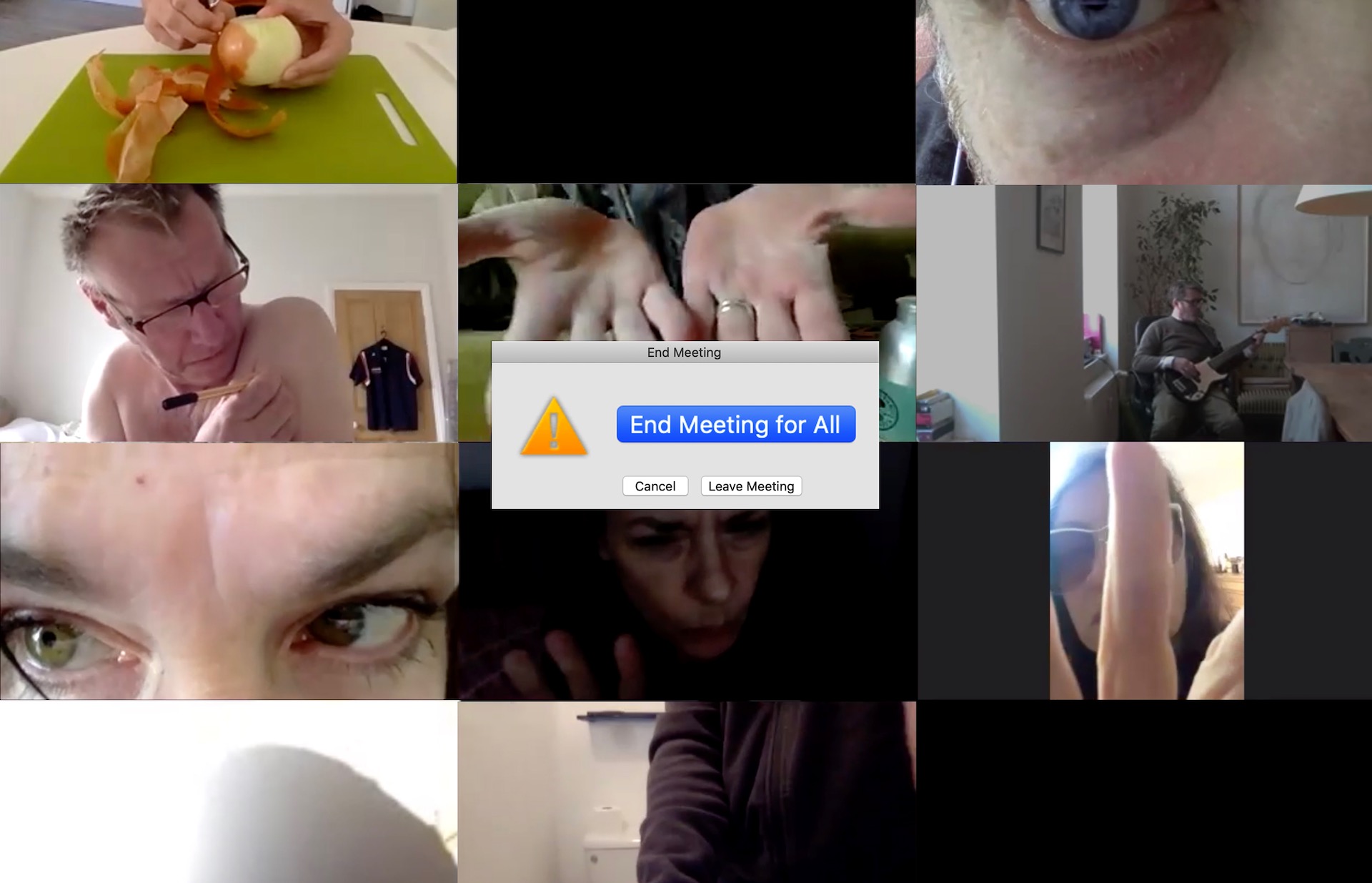 視訊會議及直播平台成了許多藝術家的擴延舞台:中國導演王翀改編卡繆的《鼠疫》(The Plague,2021)讓六位位於不同時區與城市的演員在zoom上交遇,交流疫情下的孤獨與恐懼;英國強迫娛樂劇團(Forced Entertainment)的《為所有人結束會議》(End Meeting for All,2020)則是把視訊會議視為聚會情境,演出幾位好友如何在家對著螢幕殺時間;阿根廷藝術家蘿拉.阿里雅絲(Lola Arias)策劃的《我的文件:分享你的螢幕》(My Documents: Share Your Screen,2020)則邀請藝術家把自己收藏的影像材料轉化為講座式展演(lecture performance);阿布莫維奇學院(Marina Abramović Institute)直播加拿大藝術家邁爾斯.格林伯格(Miles Greenberg)連續24小時在一台跑步機上走路的行為藝術《Oysterknife》(2020)。