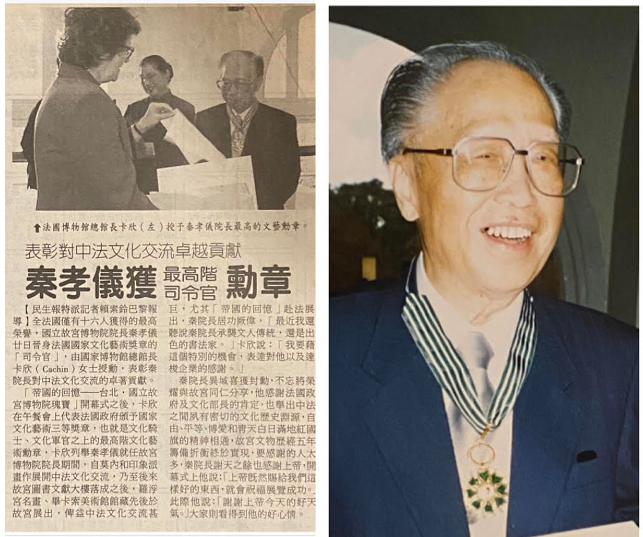 1998年,國立故宮博物院赴法特展「帝國的回憶」在巴黎的大皇宮隆重開幕。筆者有幸為故宮代表團的成員,並於特展開幕後,在大皇宮的慶功宴,見證了秦院長獲頒法國文化部最高等級的「藝術與文學司令勳章」的榮耀時刻。22年後,筆者於2020年獲法國文化部授予騎士級的「藝術與文學勳章」,能與敬佩的臺灣文化界前輩們一樣成為法國受勳家族的成員,深感榮幸。