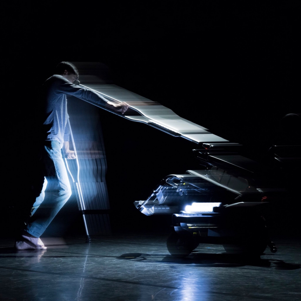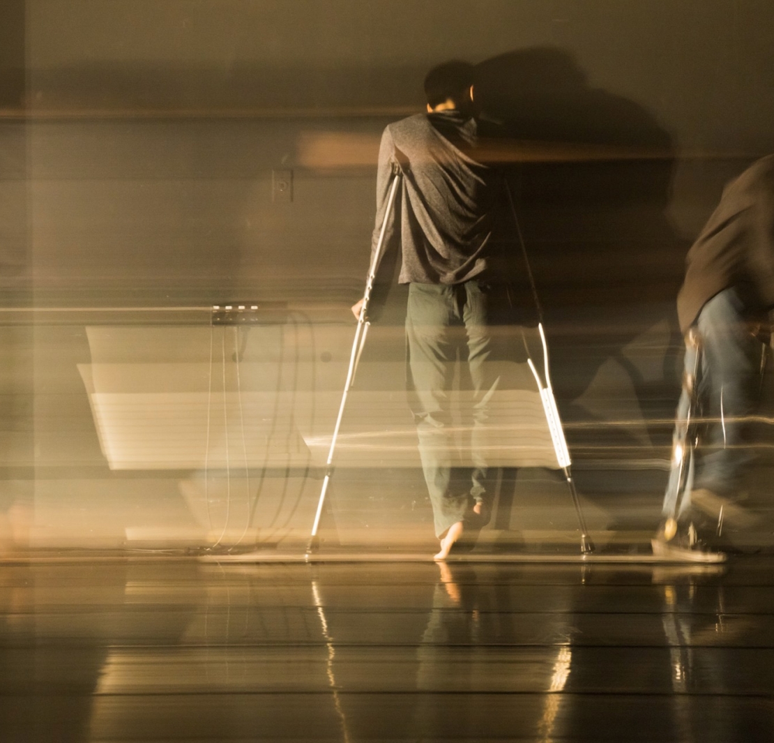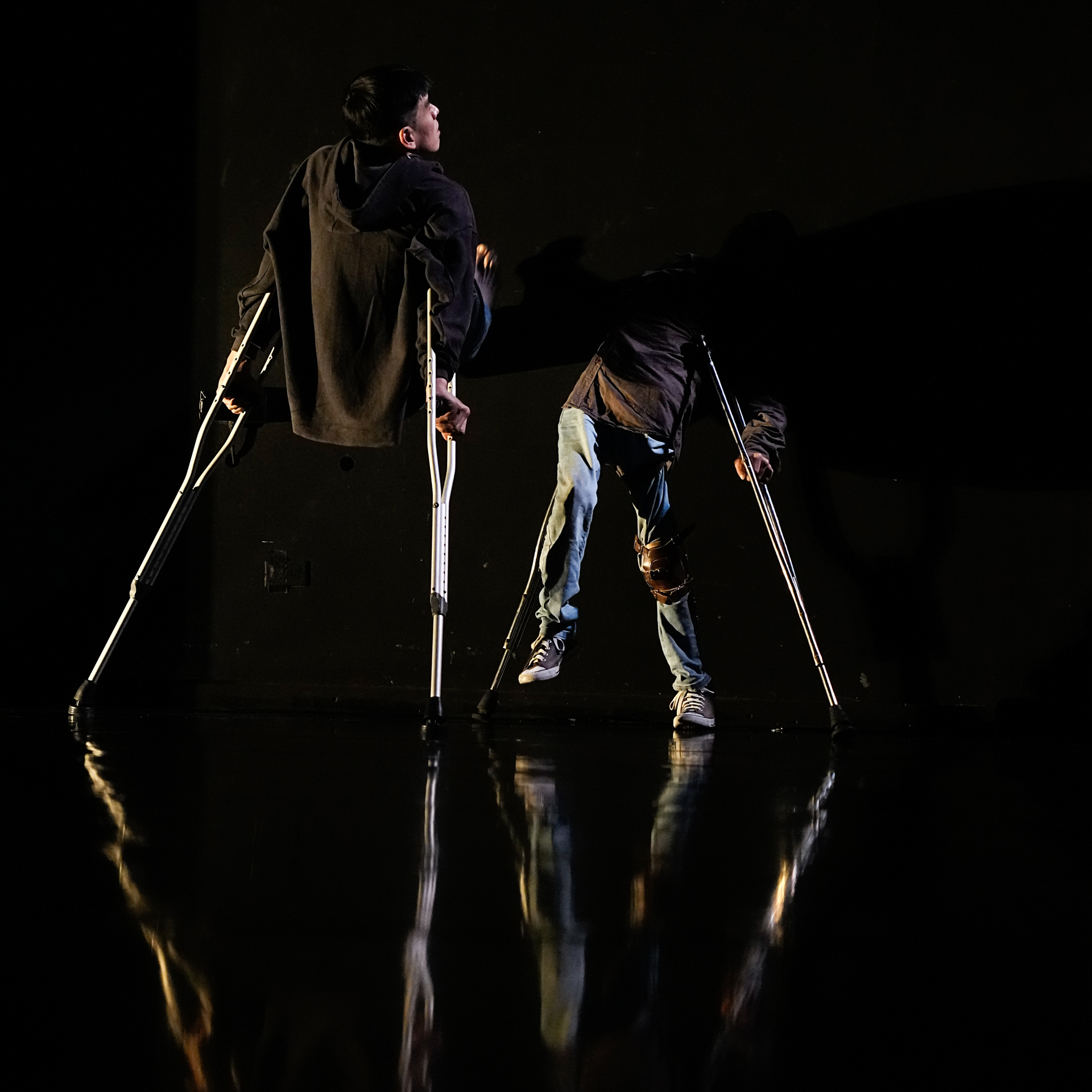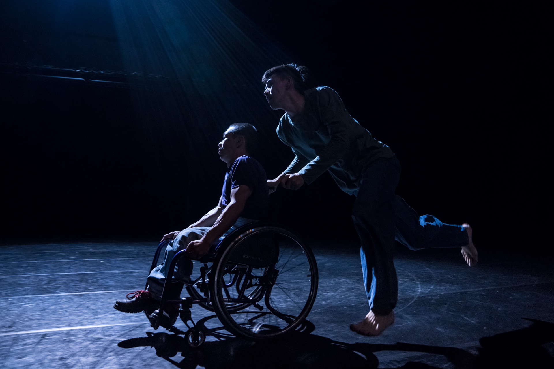 接下來好幾幕,阿忠與書毅藉由電輪椅、手動輪椅、拐杖等輔具,試驗出不同的身體型態。轉圈、後退走、手背平舉向前、追逐對方的舞台表演,皆是非常可見的高度排練成果,以至一場美輪美奐的精緻舞蹈。唯有一段是毫無任何外在工具的借力使力下,倆人透過最本質的身體進行相遇、接觸、交纏;是在演出前就可預期、也是我最期待看見的段落。