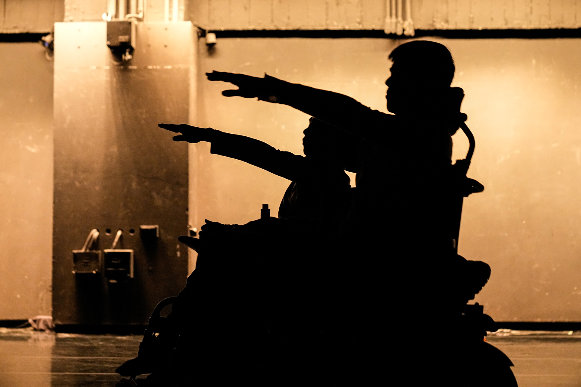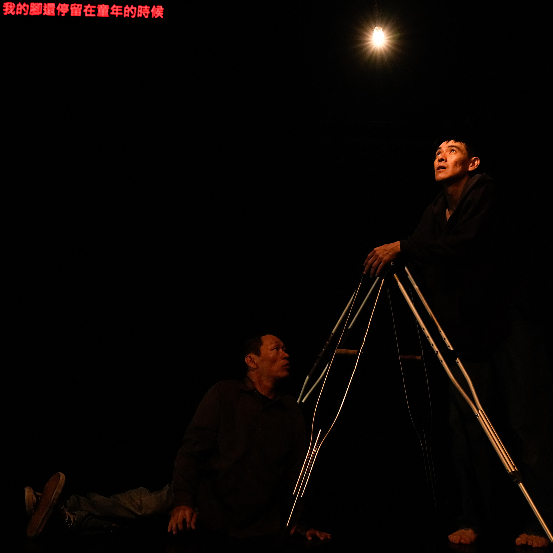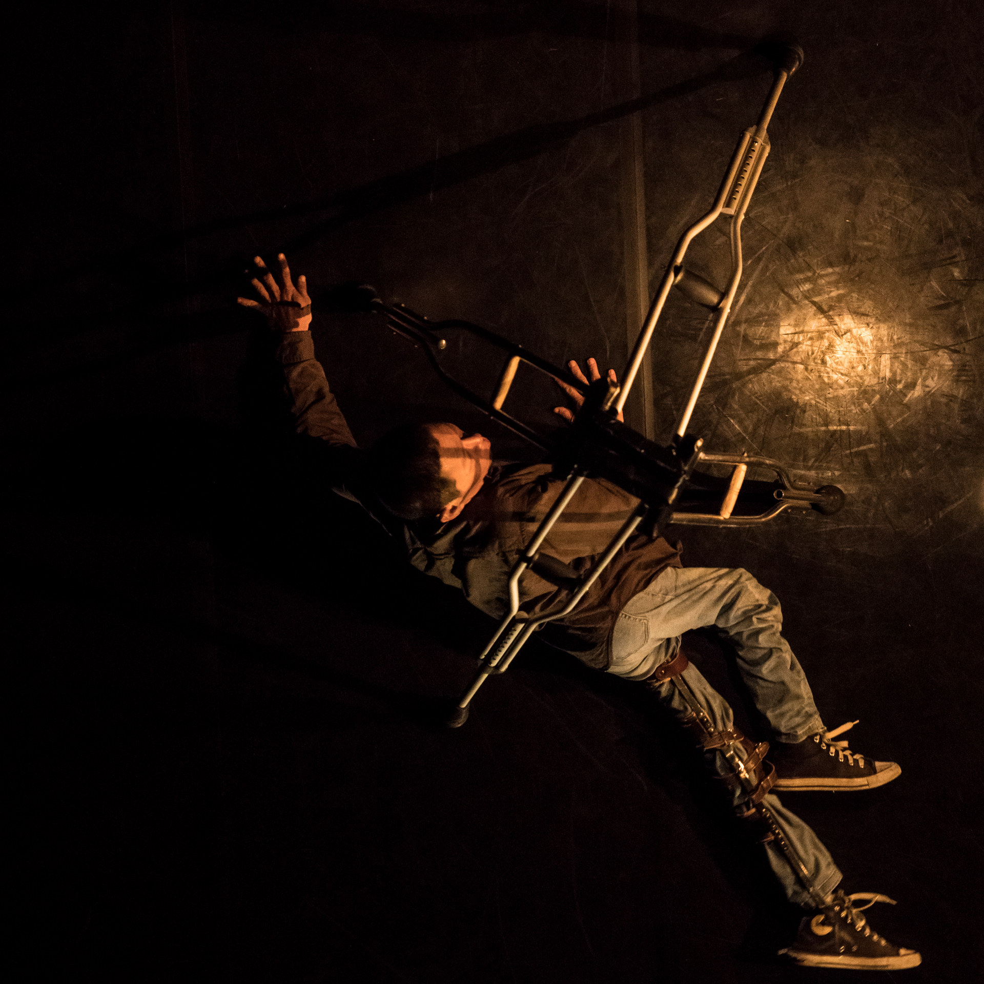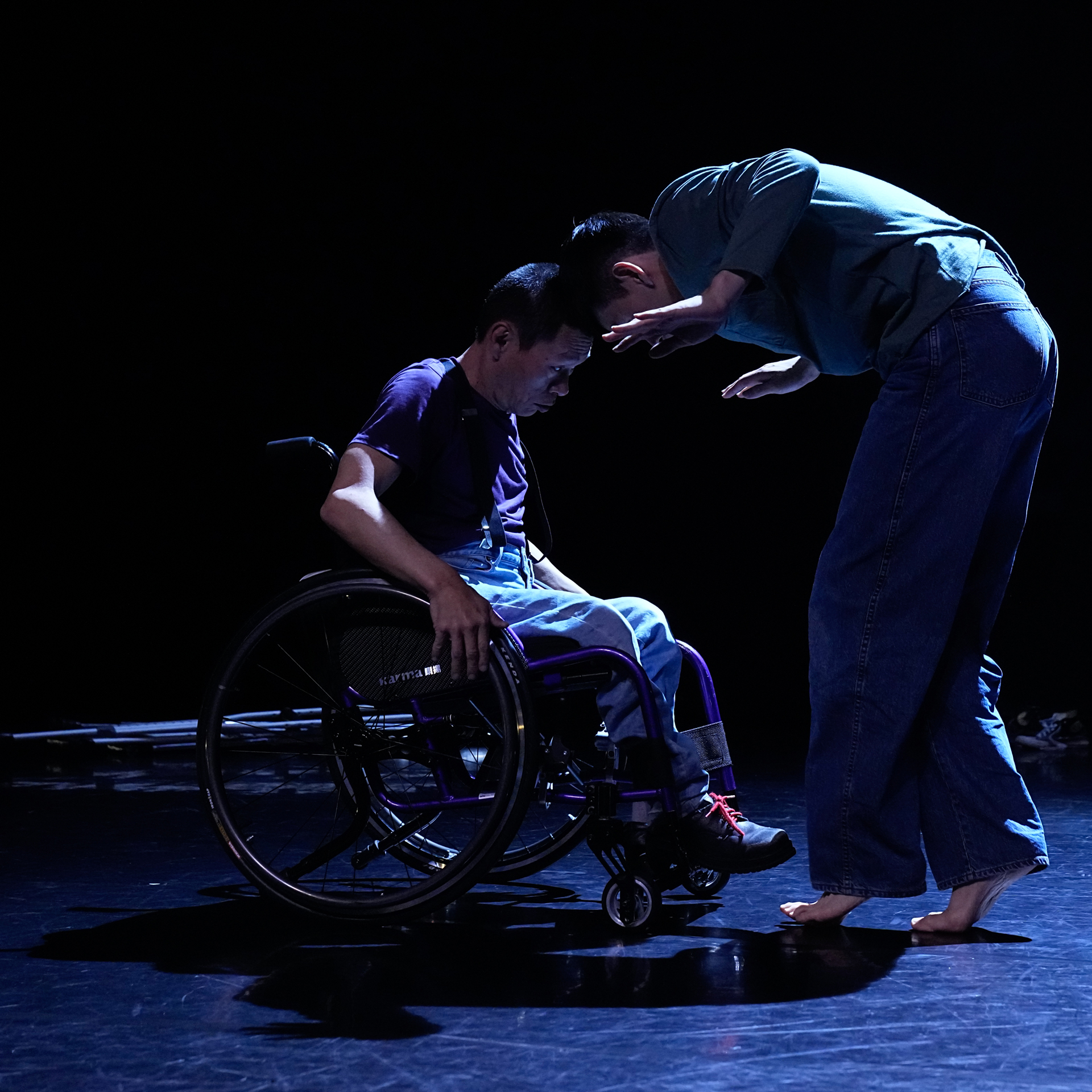 接下來好幾幕,阿忠與書毅藉由電輪椅、手動輪椅、拐杖等輔具,試驗出不同的身體型態。轉圈、後退走、手背平舉向前、追逐對方的舞台表演,皆是非常可見的高度排練成果,以至一場美輪美奐的精緻舞蹈。唯有一段是毫無任何外在工具的借力使力下,倆人透過最本質的身體進行相遇、接觸、交纏;是在演出前就可預期、也是我最期待看見的段落。