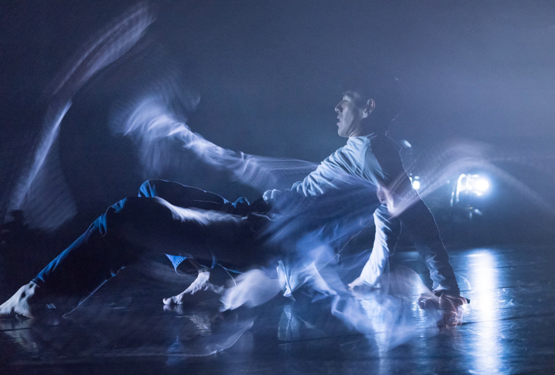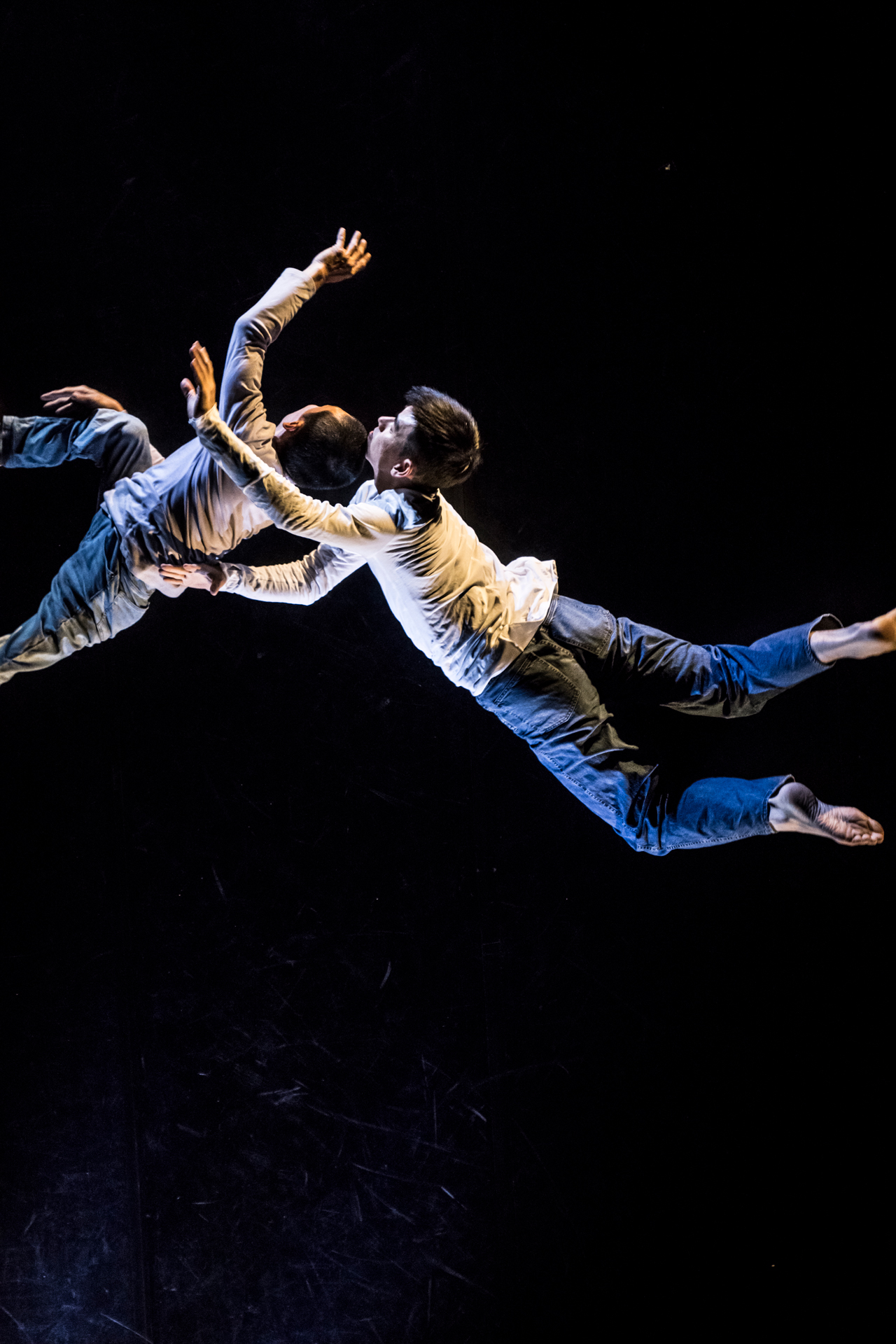 下一段落,阿忠獨自在台上,練習各種肢體伸展的方式。一旦過高的重心偏移,身體隨即倒下。從聚焦的燈光與貫穿幾乎三分之一時間的抒情配樂,襯托著阿忠的日記體旁白,無不催生感性的現場力量與集體專注的召喚。透過效果器放大撲到在地的聲響,每個挫折的剎那片刻都擲地有聲,彷彿也強化了失足人生卻越挫越勇的意象。